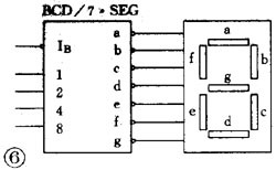 二極管,當(dāng)每個(gè)段與低電平0連接時(shí),七個(gè)段亮起并顯示數(shù)字“8”;例如,段b和c與低電平0連接,其余段與1連接。顯示“1”??梢钥闯?,十進(jìn)制數(shù)字必須用七段顯示管解碼一次。如果“4線7線解碼器”與顯示管一起使用,這非常簡(jiǎn)單:輸入二進(jìn)制代碼直接顯示十進(jìn)制數(shù)字,如圖3所示。解碼器左側(cè)有四個(gè)二進(jìn)制碼輸入,右側(cè)的7個(gè)輸出可以直接連接到數(shù)字管。左上方是來(lái)自控制端子IB的另一盞燈。在正常操作期間,應(yīng)增加高電平1。如果不需要數(shù)字顯示,則應(yīng)將低電平0添加到IB以關(guān)閉數(shù)字顯示。